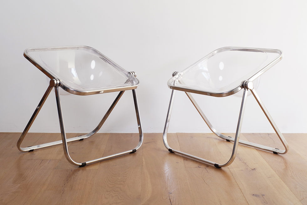 プリアチェアに続き、ジャンカルロ・ピレッティが1970年にデザインしたフォールディングチェア「プロナ」が入荷しました。アノニマカステッリ社製の現行品ユーズド、クリアカラーのクロームフレームモデルになります。