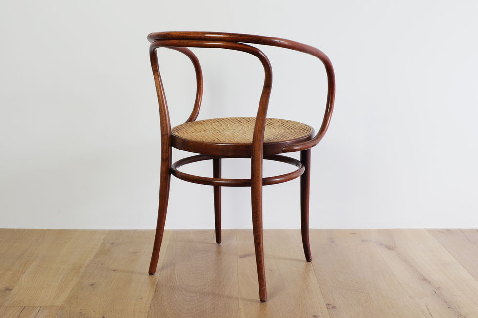 ル・コルビュジエも愛用していたModel.209。第二次世界大戦後にヨーロッパ各地に枝分かれした生産工場によってアームの形状に違いがありますが、この無理のない自然なフォルムのアームはドイツ・トーネット社ならではです。片手で持ち上げられるほど軽量ですが非常に丈夫で、籠目編みの籐座面が程良い弾力で優しく体を受け止めてくれます。
