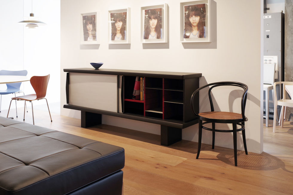 ペリアンが1939年に自 邸用にデザインしたキャビネットをカッシーナ社が復刻生産しているモデル。マットブラック塗装の天板と底板は僅かに湾曲しており、一枚板の無垢材のような重厚感が感じられます。アルミサテン仕上げのスライドドアを開けると、ボルドーカラーの仕切りがアクセントとなっています。左2列のアルミ棚板は可動式になっており、寛容な収納力も魅力です。
