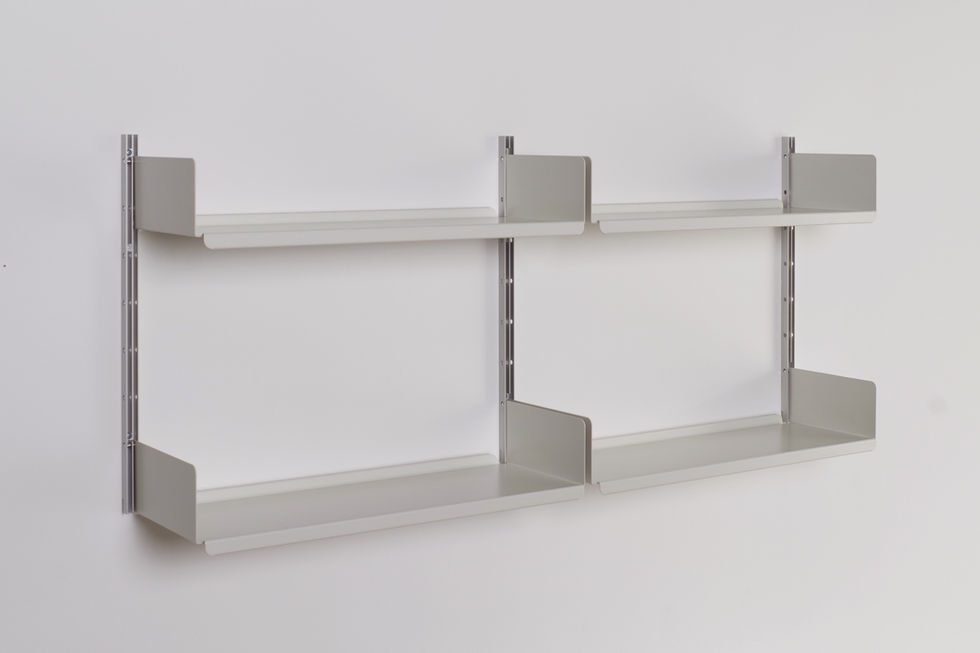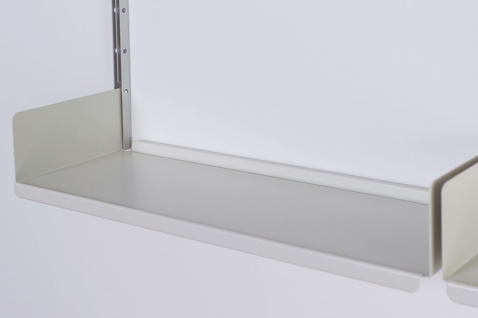 こちらはオフホワイトカラーのメタルシェルフ(w655 d220mm)×4枚と壁面固定用のEトラック(570mm)×3本のセットで、コンパクトなブックシェルフやディスプレイラックとしてご活用いただけると思います。セットを追加していただくことで拡張することも可能です。
