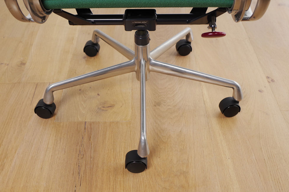 グリーンカラーのシートは純正ファブリックのままで、若干の褪色は感じられますが汚れやシミもなく大変清潔な状態を保っています。アームレストも僅かな小キズ程度で綺麗な状態です。キャスターはすべて新品に交換しましたので気持ち良くお使いいただけると思います。
