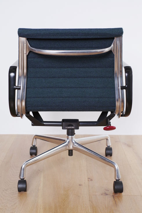 ハーマンミラー社のイームズ・アルミナムグループチェアです。1989年製のヴィンテージ品、ブルーグリーンカラーのファブリック張りローバックタイプに4スターキャスターベースのモデルになります。