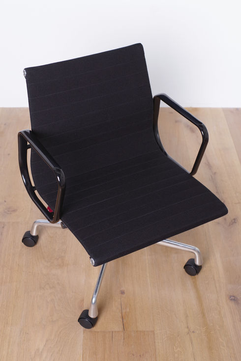 ハーマンミラー社のイームズ・アルミナムグループチェアです。1989年製のヴィンテージ品、ブラックカラーのファブリック張りローバックタイプに4スターキャスターベースのモデルになります。