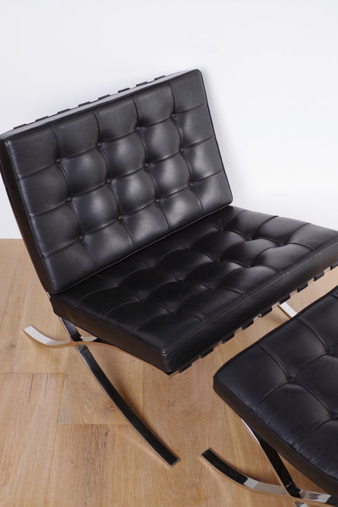 1929年に開催されたバルセロナ万国博覧会のドイツ館・バルセロナパビリオンのためにミース・ファン・デル・ローエがデザインしたKnoll社のバルセロナチェア&オットマンのセットです。1980〜90年製のセミヴィンテージコンディション、ブラックレザーのモデルになります。