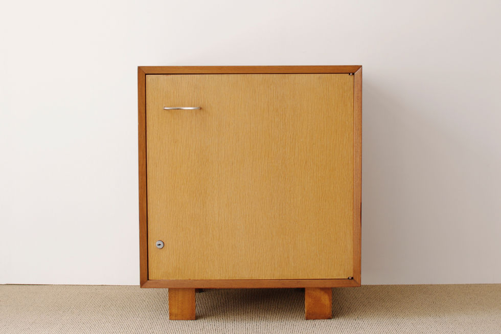 当時のカタログによると、20種類以上のサイズバリエーションをベースに、材質や脚部、取手の種類等、自由に組み合わせができるセミオーダーシステムが導入されていたようです。こちらは片開きのドアが付いた#4702というモデルで、ウォルナットの本体にオーク材のドアを組み合わせた珍しい仕様になっています。内側は棚板が2枚付属しており、高さ調整もできます。