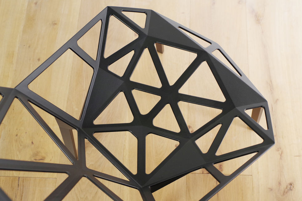 三角形を多角的に組み合わせて立体化さ せたデザイン。2003年のブループリント賞を皮切りに、数々のデザイン賞を受賞したモデルでもあります。斬新でグラフィカルな見た目とは対照的に、優しく体に馴染む快適な座り心地です。アルミダイキャスト製で屋外でも使用でき、8脚までスタッキングすることもできます。