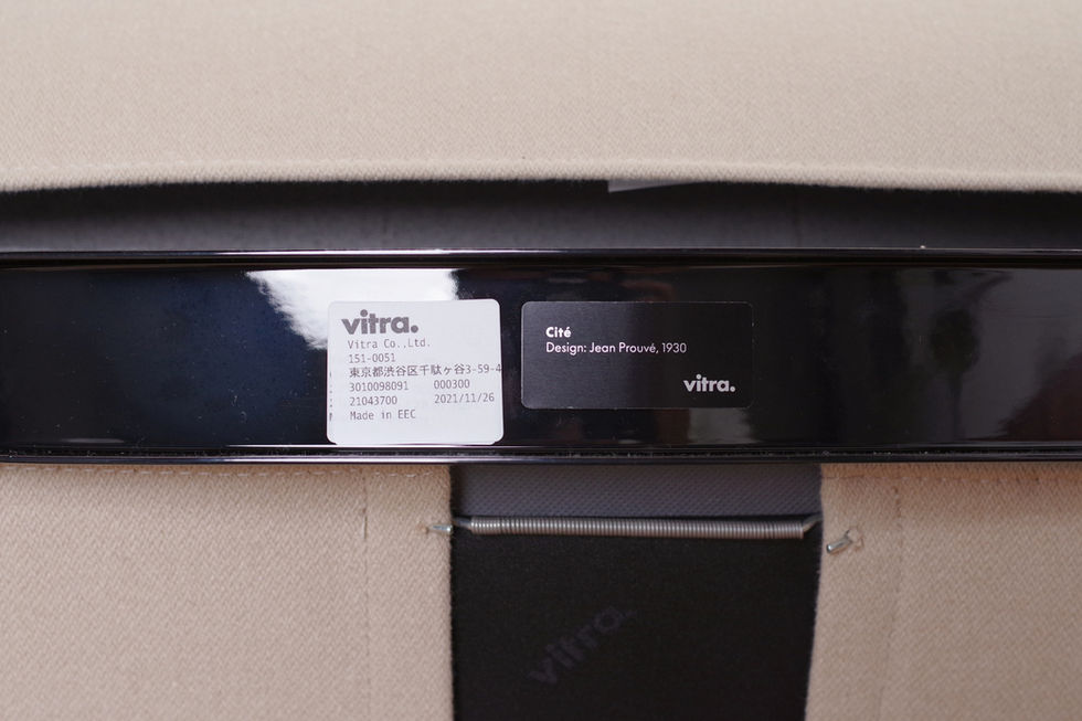 ジャン・プルーヴェが1930年にデザインしたヴィトラ社のシテアームチェアです。2021年製の現行品ユーズド、ベージュファブリック×ディープブラックフレームのモデルになります。