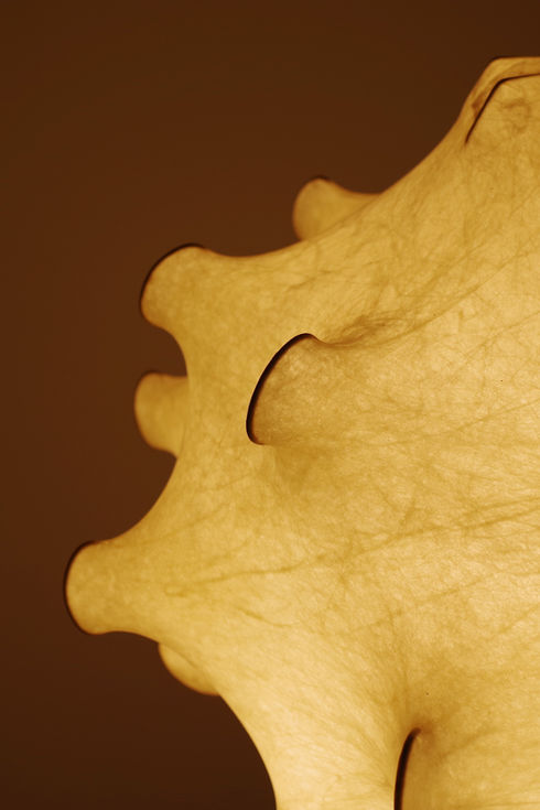 スチールフレームに当時の新素材であった「COCOON(コクーン)」と呼ばれる特殊樹脂を吹き付けシェードを成形。その繭のようなシェードは不思議な弾力を持ち、フレームの形状と透過する柔らかい光がカスティリオーニ兄弟ならではの独創的な作品です。