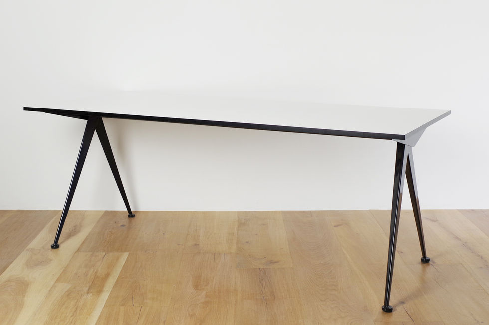 ジャン・プルーヴェが1953年にデザインしたコンパステーブルです。2002年にVitra社より復刻された「Prouve Collection」の正規品ユーズド、ホワイト天板×ブラックベースのモデルになります。