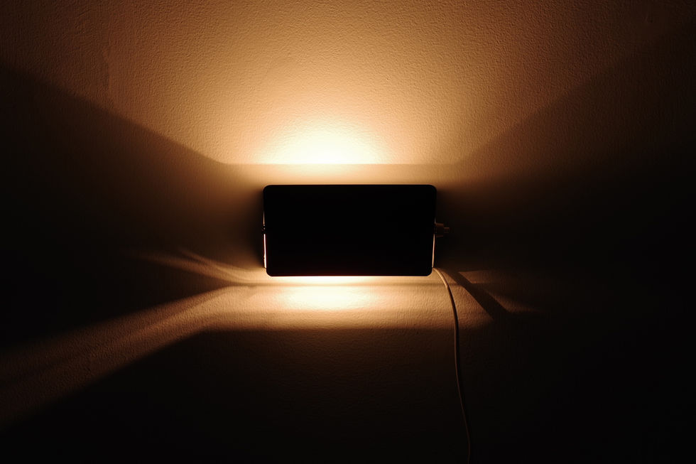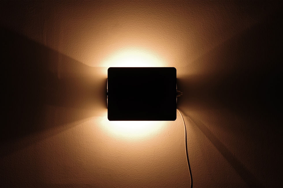 薄いスチール板を折り曲げた簡素な構造ですが、可動式のフラップで光の向きを仕切ることができます。本体横に付いたスイッチでON/OFFができますので、壁掛けとしてだけでなくそのまま置いてテーブルランプやベッドサイドのランプとしてもご使用いただけます。