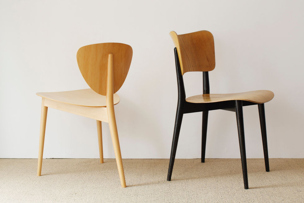 非常に薄いプライウッドの背もたれと座面を座面下で交差したフレームで支えた構造。大きく湾曲した背もたれが体をしっかりと支え、座り心地は大変素晴らしいものです。