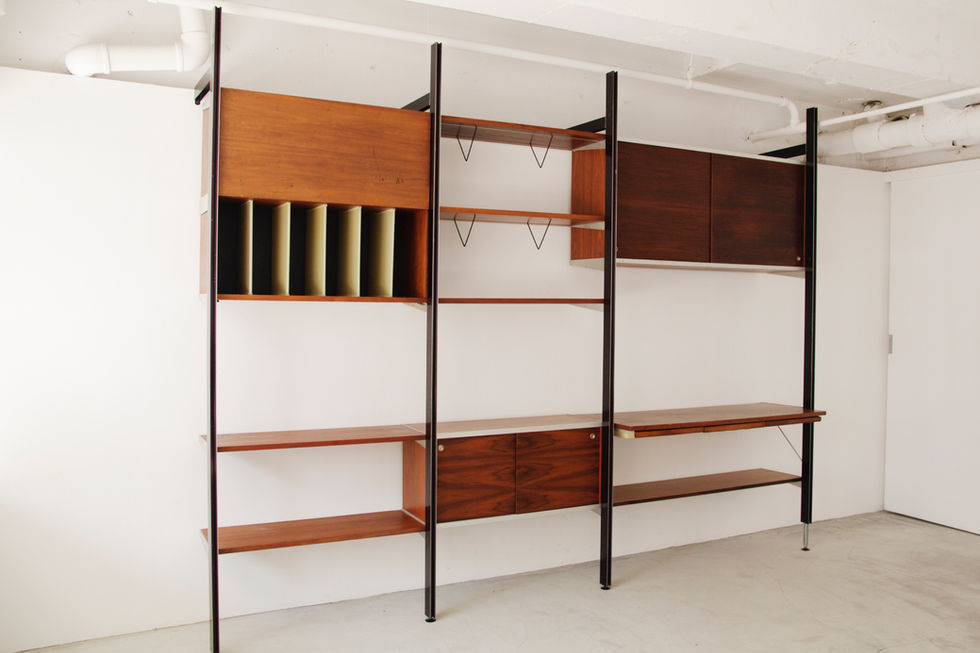 アルミ製の支柱と木製の棚板や収納ユニットの組み合せで、様々なセッティングや拡張を可能にした画期的なシステムです。1959年に発売され、73年には生産終了となったため、現行品で手に入らないネルソンアイテムのひとつです。