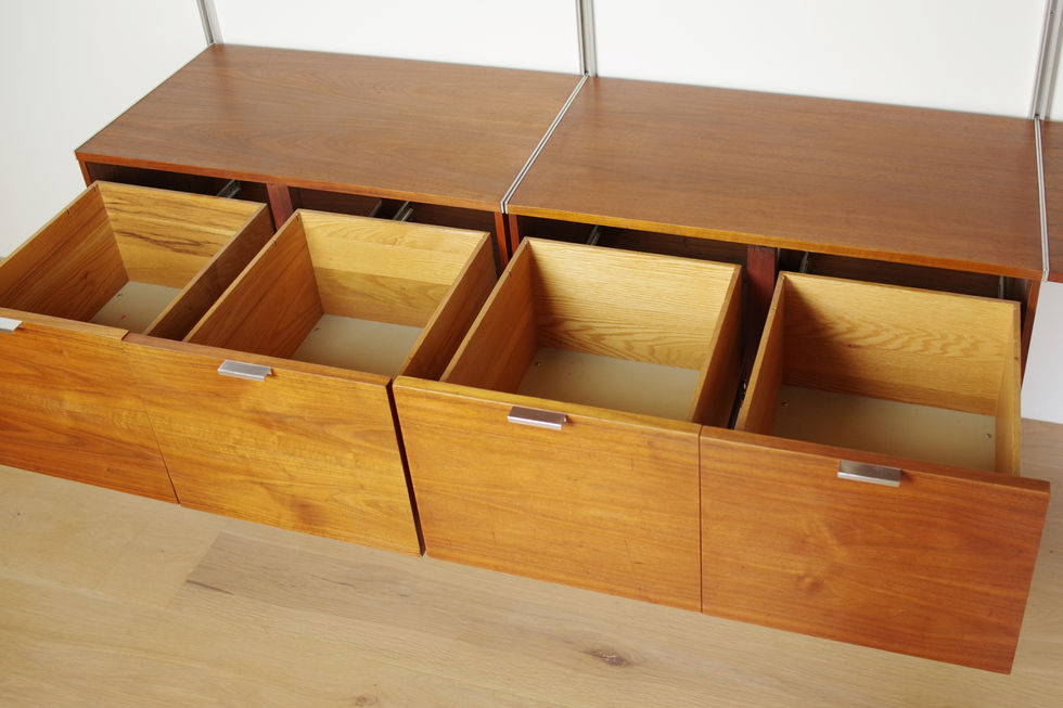 アルミ製の支柱と木製の棚板や収納ユニットの組み合せで、様々なセッティングや拡張を可能にした画期的なシステムです。生産期間は1959~73年までと短く、以降復刻もされていないため、ネルソンデザインのなかでも入手困難なアイテムのひとつです。