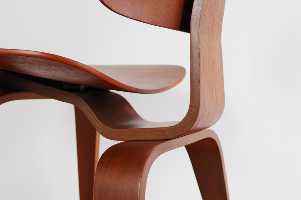 5つのパーツで構成され、強度面、デザイン面ともに成型合板の特徴を最大限に生かした椅子。イームズの代表作とも言えます。当時、生産をエヴァンス社が、販売をハーマンミラー社が担いました。