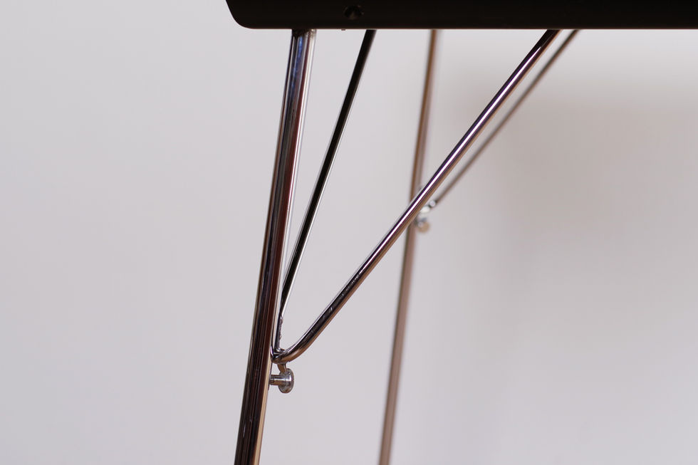 V字型のロッドで脚を支える簡素な構造ですが、ワンタッ チで折りたたみができ、また安定感にも優れた非常に合理的な構造です。Vitra社とハーマンミラー社で復刻生産されていましたが、どちらも10年程前に廃番となってしまったため現在は入手困難なモデルとなっています。