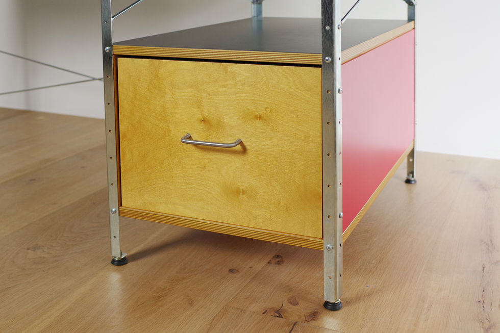 1949年に開催されたDetroit Institute of Artの展示用に製作されたものを製品化したもので、Lアングルと積層合板の棚板、カラーパネルの組み合わせで、様々なバリエーションを展開していました。オリジナル品はストレージユニットと共に1955年まで5年間ハーマンミラー社で製造・販売されていましたが、こちらは同社が復刻生産している現行品で右側に引き出しが備わったマルチカラーパネルのモデルになります。天板も広く安定感のあるデスクです。