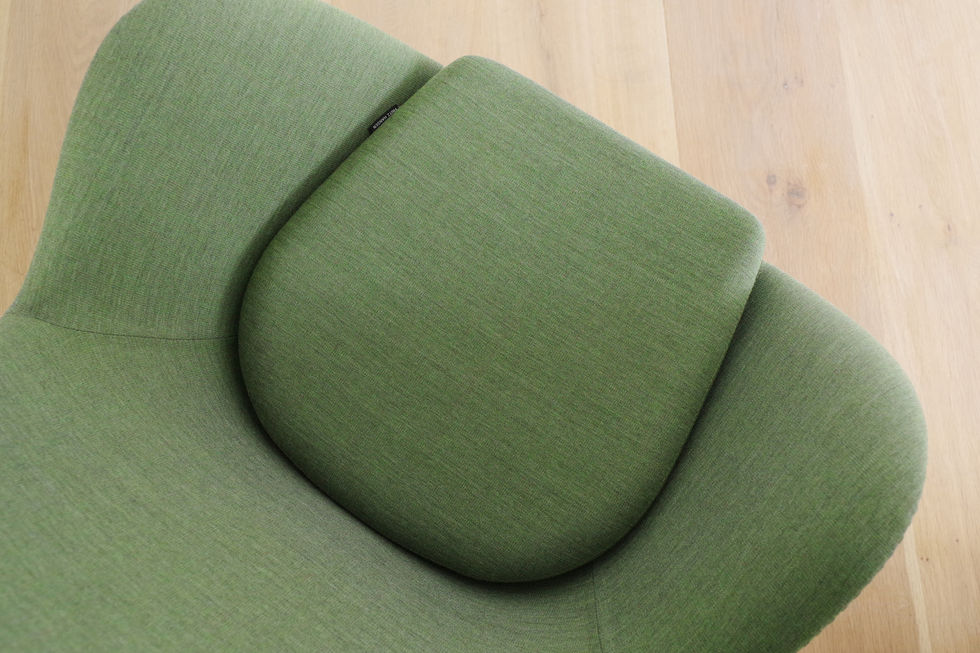 その名の通り卵を曲線で切り取ったような有機的なフォルムのシェルはウレタンフォームで覆われ、ファブリックはすべて職人が手縫いで張り込んでいます。包み込まれるような座り心地は非常に贅沢なもので、存在感のある一脚です。ベースは回転機能とチルト機能(リクライニング)が付いており、付属のレバーで硬さ調整もできます。