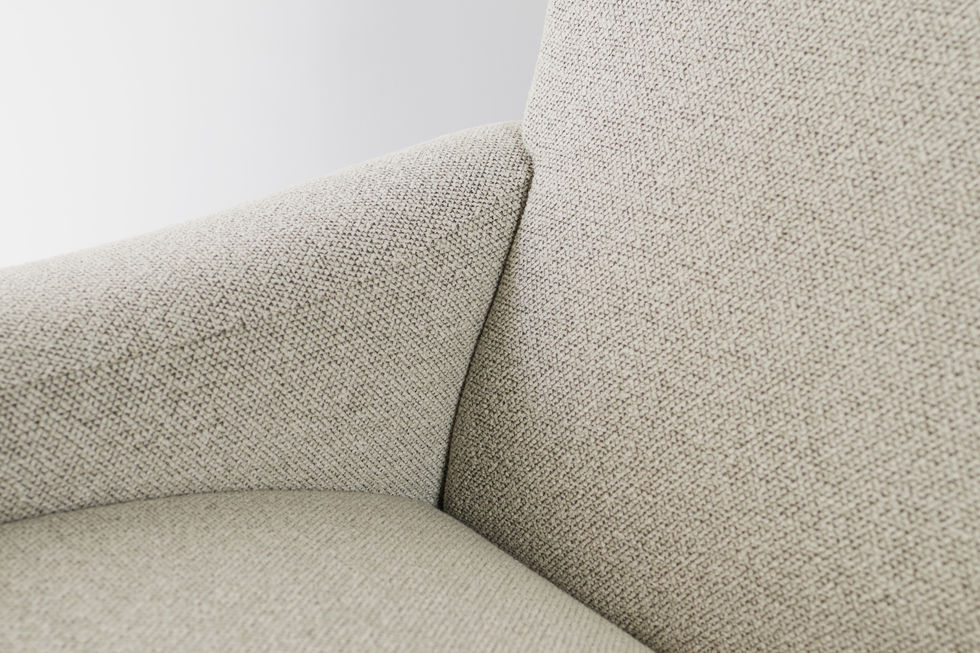 シートファブリックはオフホワイトとブラックの糸が混合したアイボリーカラーで、新しく張り替えましたので新品同様のコンディションです。座面のヘタリも感じられず、気持ち良くお使いいただけると思います。