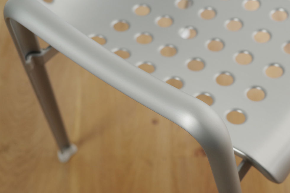 アルミニウム素材にパンチングをあけることで軽量化と水抜きの機能を両立させたガーデンチ ェア。1939年にスイス・チューリッヒで開催されたスイス国際博覧会の公式屋外用チェアとしても採用されました。屋外での使用ができ6脚までスタッキングも可能です。