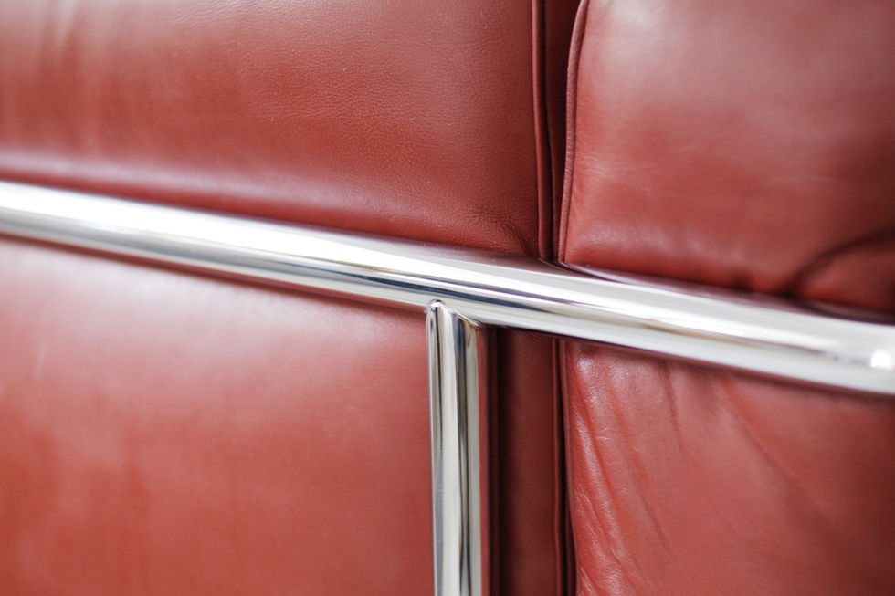 使用に伴う本革特有のシワや目立たない薄い汚れは見られますが、大きなキズやヒビ割れ等もなく、良好なコンディションです。程良いツヤも残っています。パイプフレームは底側の目立たない部分に小さなサビは見られますが、見える部分にサビはなく、美しい光沢を保っています。ウェービングテープにたるみも見られません。ご家庭はもちろん、オフィスやビルのエントランスにもおすすめのソファです。