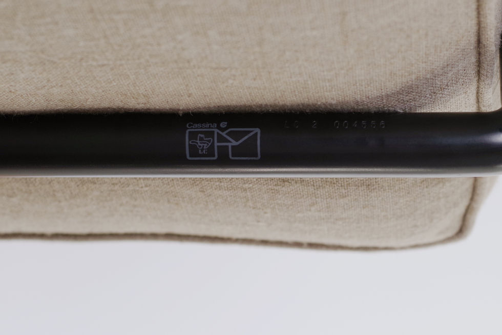 カッシーナ社「イ・マエストリ・コレクション」のLC2 1seatです。1980年代製のヴィンテージ品、ブラックフレーム×ナチュラルリネンファブリック張りのモデルになります。