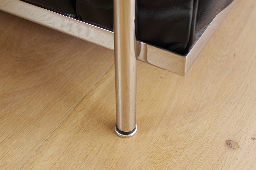美しいクローム仕上げのスチールパイプフレームに6枚のクッションをはめ込んだだけの簡素な構造ですが、座面下で格子状に組まれたウェービングテープによって適度な沈み込みがありゆったりと体を受け止めます。背もたれとアームクッションの中材は上位ランクのフェザーパディングで、ゆっくりと空気が抜けていくような贅沢な座り心地を実感できます。オフィスライクなLC2に対しこのLC3は奥行きを深く、座面高を低く設定されているので、ホームユースソファとして理想的なサイズ感です。