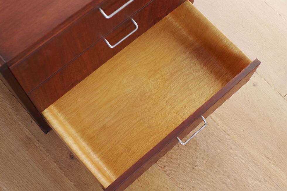 こちらは3段の引き出しが備わった小振りなチェストで、繊細な引き手とチーク材のコントラストが印象的です。引き出し内部はプレス成形されたプライウッドで仕上げられています。