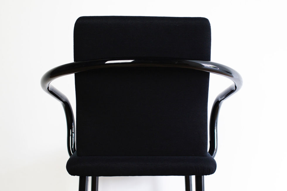 1980年代にイタリアを中心にポストモダンムーヴメントを巻き起こしたデザイナー集団「Memphis」の中心人物でもあるソットサス。曲木椅子のようにアームから背もたれにかけてループするパイプラインが特徴的で、見た目の印象以上に大変座り心地の良い椅子です。