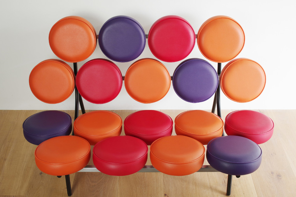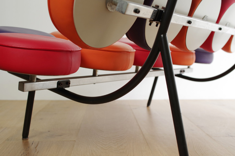 既製品のスツールの座面をそのまま用いることから着想を得た遊び心溢れるデザイン。オリジナルは1956年から61年の間わずか186脚しか生産されなかったため、海外のオークションハウスでも高値で落札されています。この3色マルチカラーのモデルは、ハーマンミラー社から復刻された当初のもので、現在では入手困難となっています。