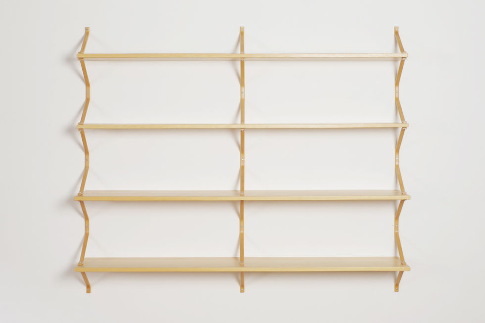 4枚の棚板(上2段が奥行230mm、下2段が奥行280mm)を、くの字型のブラケットで繋ぐ美しいウォールシェルフ。棚板は非常に頑丈なビーチ無垢材、ブラケットもマットソン独自の曲げ木が用いられ、設置後は非常に強度と安定性に優れたシェルフになります。