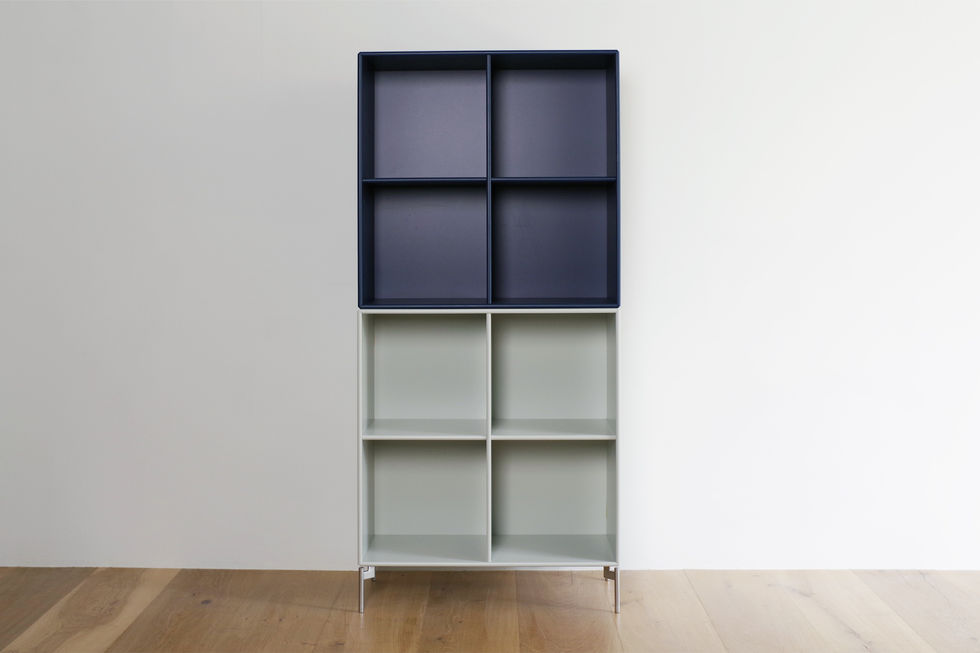 1982年に設立されたデンマーク・モンタナ社のシステムシェルフです。ジュニパーカラー(ネイビー)とノルディックカラー(ライトグレー)のオープンユニットを組み合わせブックシェルフになります。