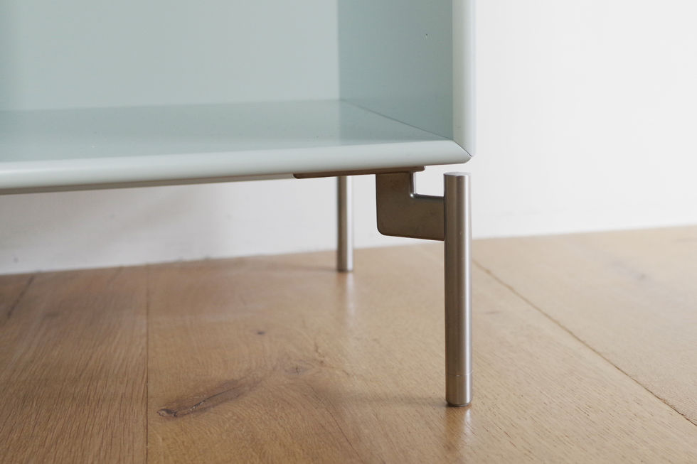 こちらは片側に扉が付いたキャビネットタイプで、可動式の棚板 が2枚付属。脚部はアジャスター機能が備わったステンレス脚になります。ダイニングの小振りな食器棚として、また寝室や子供部屋の小さな収納として、あらゆるシーンでご活用いただけると思います。