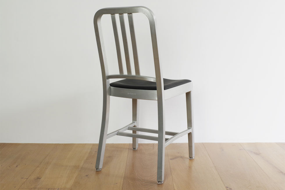 その名の通り、アメリカ海軍の潜水艦用の椅子として1944年から生産が始められたネイビーチェア。100%アルミニウム製で耐久性と軽量化に優れ、過酷な環境にも耐えるための厳正な条件をクリアし製作されています。最終行程は職人によるハンドブラッシュ仕上げ。質感が浮き立ちどこかぬくもりを感じさせるニュートラルなフォルムは、木製の家具にもとてもよく馴染みます。ウレタンの入った専用パッド付きで、座り心地も快適です。このまま屋外でもお使いいただけます。