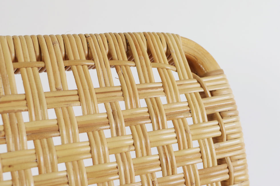 ダイニングチェアとラウンジチェアの中間にあたる410mmという絶妙な座面高で、立ち座りのしやすいリラックスチェアです。テープ張りのモデルが数年前まで同社で展開されていましたが、現在は生産終了となっています。籐張りはヴィンテージならではで、程度な弾力で優しく体を受け止めてくれます。