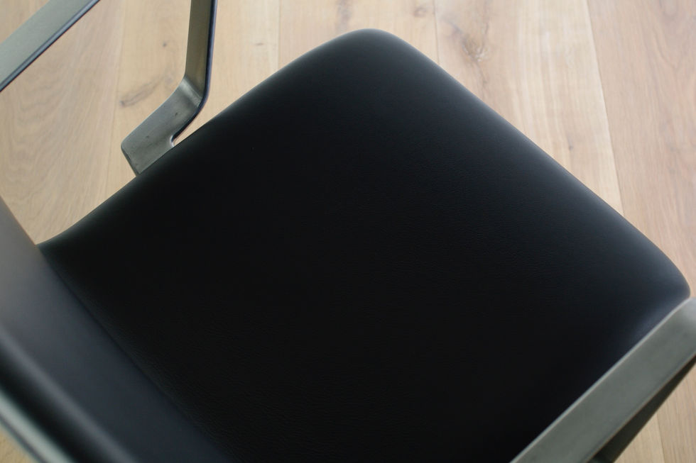 レザー表面に特筆すべきキズや汚れは見られず、大変綺麗な状態を保っています。アームやベースに若干のくすみは見られますが、全体的に非常に良いコンディションの一脚です。