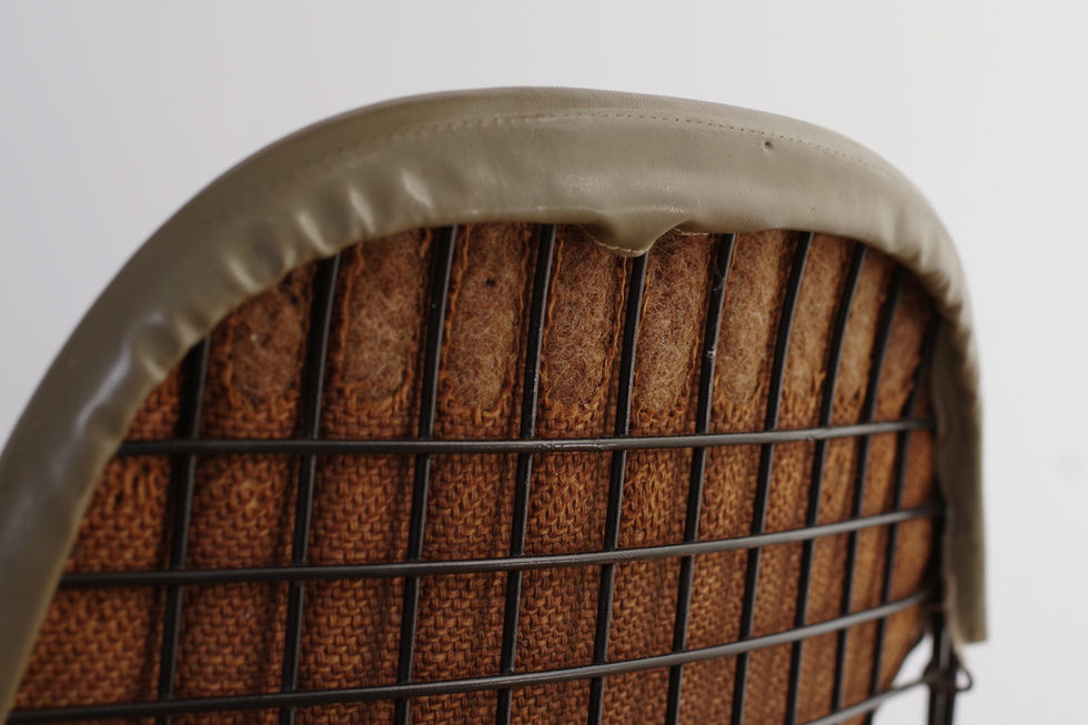 オリーブカラーのナウガハイドレザービキニパッドが付属しますが、ステッチのほつれや裏地の破れが見られるため、パッドはおまけとお考えください。(座面側のホックも欠損していますが、通常使用に問題はありません。)座面パッドの裏には当時の布製のラベルも綺麗に残っています。座面とベースの接合部分のワイヤーは凸型の2ndタイプです。
