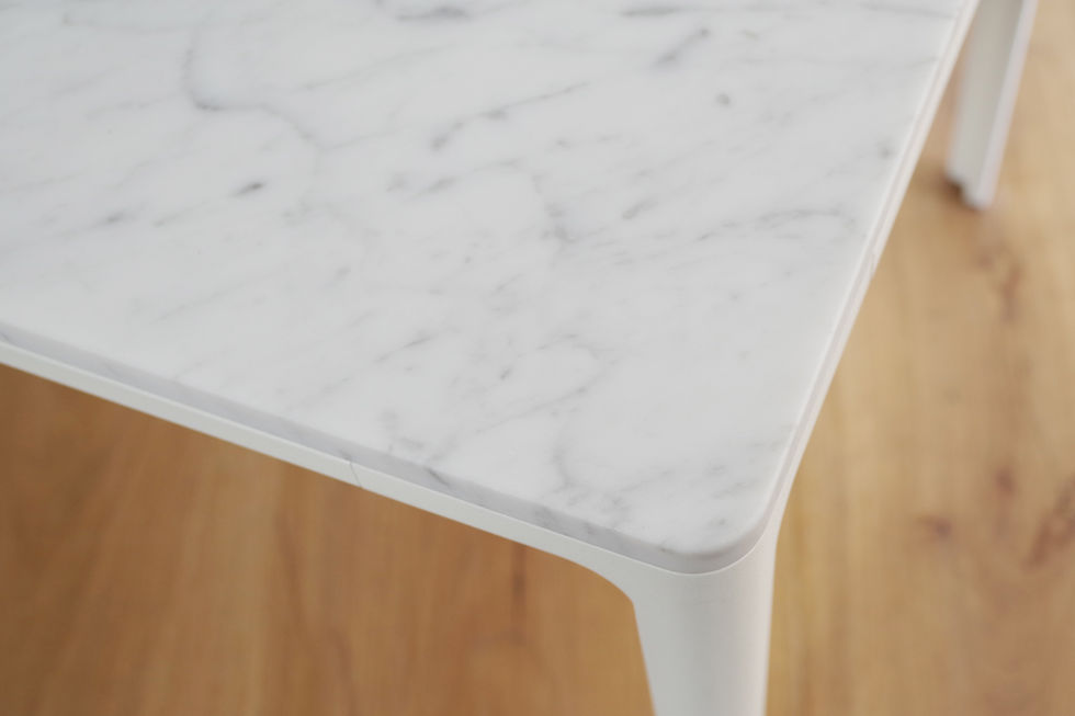 一見シンプルなデザインですが、角のR、脚部の接合部の処理等、非常に精度の高いディテールで構成されています。天板はイタリア・カラーラ産の大理石で、上品な印象を与えてくれます。使い勝手の良さそうなサイズ感も魅力です。