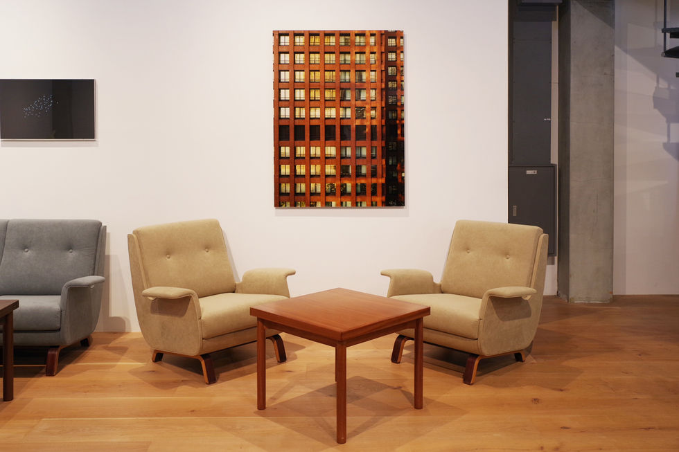やや後方に傾斜したコロンとしたフォルムに、アームレストとベースの成型は天童木工社の成形合板技術が使われており、自重での安定感もある非常に頑丈な作りです。ベースの先端も床から僅かに浮いたように見えるよう工夫されています。当時から48年間、天童木工社で生地の張替え等のメンテナンスを受けながら同ビル内で使われてきましたが、ビルの取り壊しに伴いそのうちの1人掛けソファ4脚、3人掛けソファ1台のみが竣工以来初めて放出されることになり、BUILDINGでお預かりして販売させていただけることになりました。