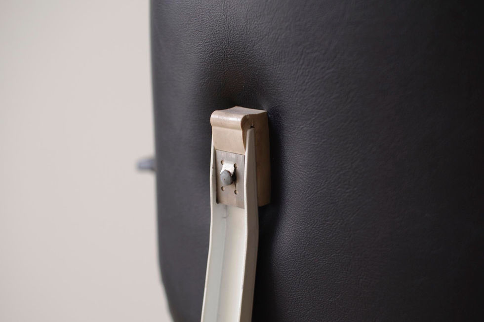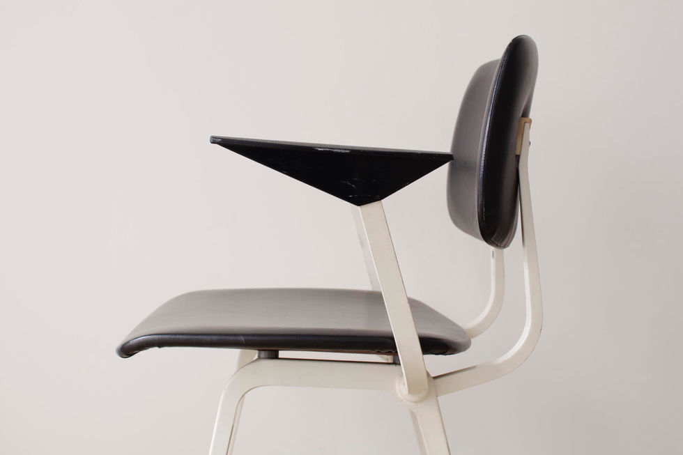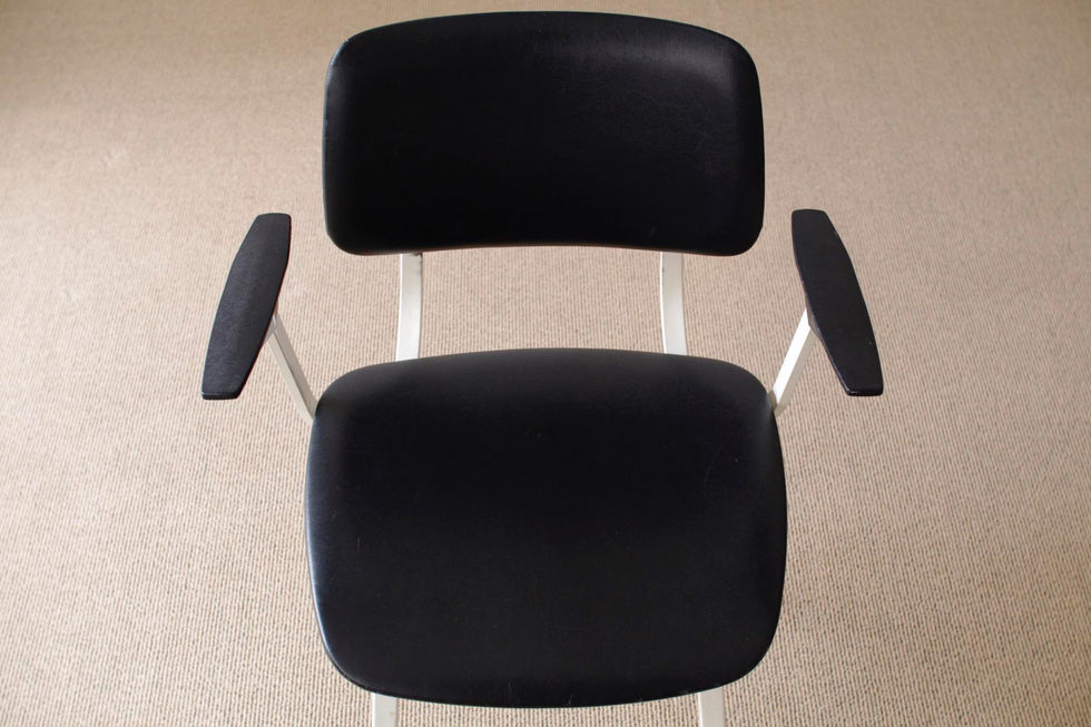 70年代製のオリジナルコンディション。スチールフレームの構造が特に美しく、独特なスタイルを持ったチェアです。背もたれと座面はブラックのビニールレザー張り、アームは樹脂製になります。