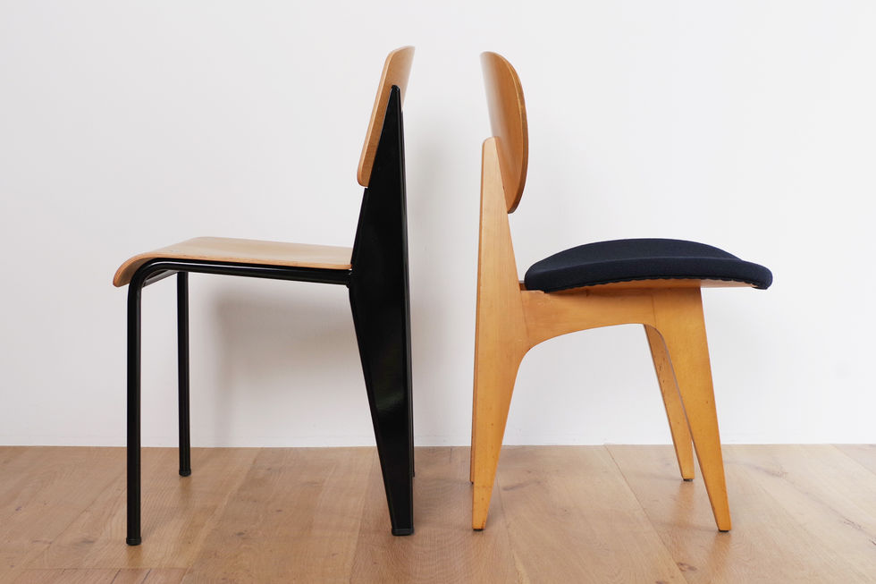 1940年代後期、ジャン・プルーヴェと親交のあった坂倉は建築の力学を応用しスチールと成型合板を組み合わせたプルーヴェのスタンダードチェアに感銘を受け木製チェアの試作に着手。幾度もの改良を重ね1953年頃には現在の小イスの原型となるモデルが完成します。現在は「model 3221 / 3222」という品番で海外のオークションハウスでも取引されていますが、当時のカタログでは「背座とも板張り=5012」「背板張り・座布張り=5013」「背座とも布張り=5014」という品番で掲載されていました。発売から間もなくして座面のみファブリックが張られた5013は廃番となり、背座とも板張り・背座とも布張りの2モデルの展開となり現在に至ります。そのため座面のみファブリックが張られた仕様は一般流通しておらず入手困難なモデルとなっています。