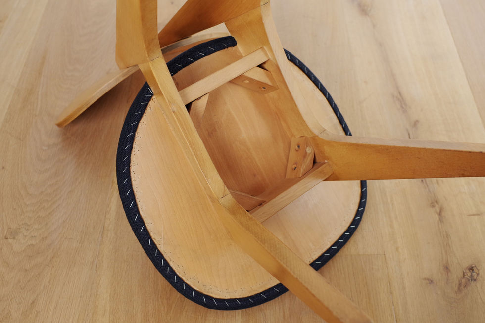 経年の小キズやスレ、目立たない補修跡はございますが構造的な不具合はまったく見られず、実用的なコンディションを保っています。濃紺カラーの座面ファブリックはデンマーク・クヴァドラ社の『Kvadrat / Raf Simons』の生地を用い新しく張り替えました。中材のウレタンも新調しましたので気持ち良くお使いいただけると思います。