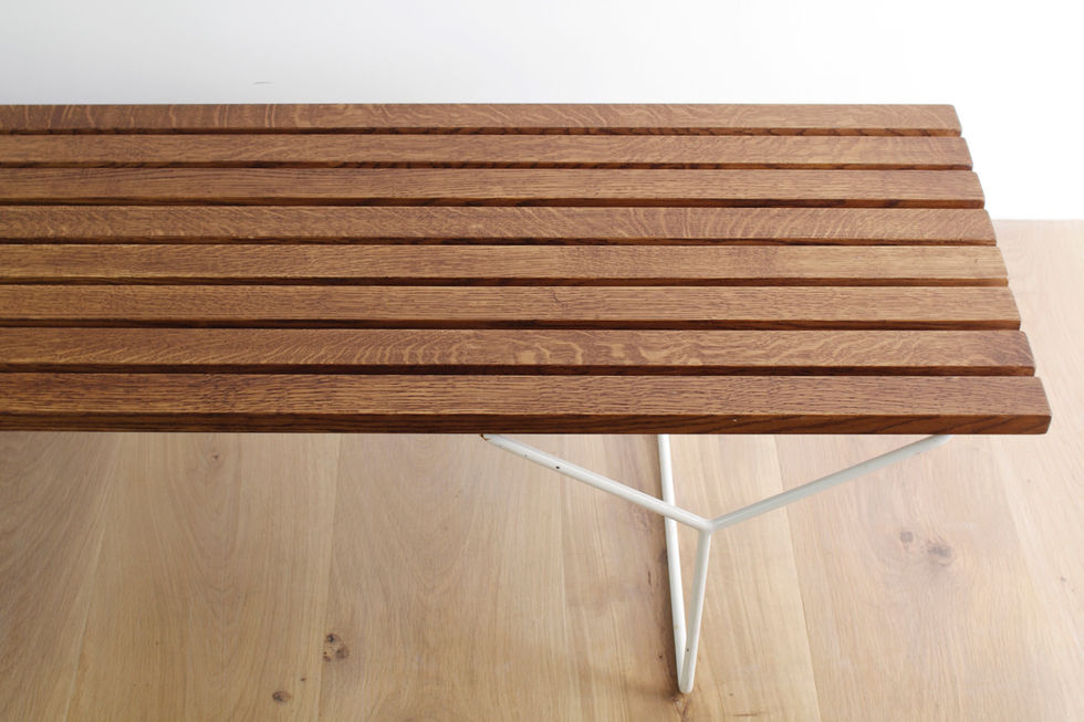 スノコ状に並べられた8本の無垢材をY字型の2本の脚で支えたシンプルな構造で、バランスと造形が非常に美しいベンチです。ベンチとしてのご使用はもちろん、テレビ台やコーヒーテーブルとしてもご活用いただけます。
