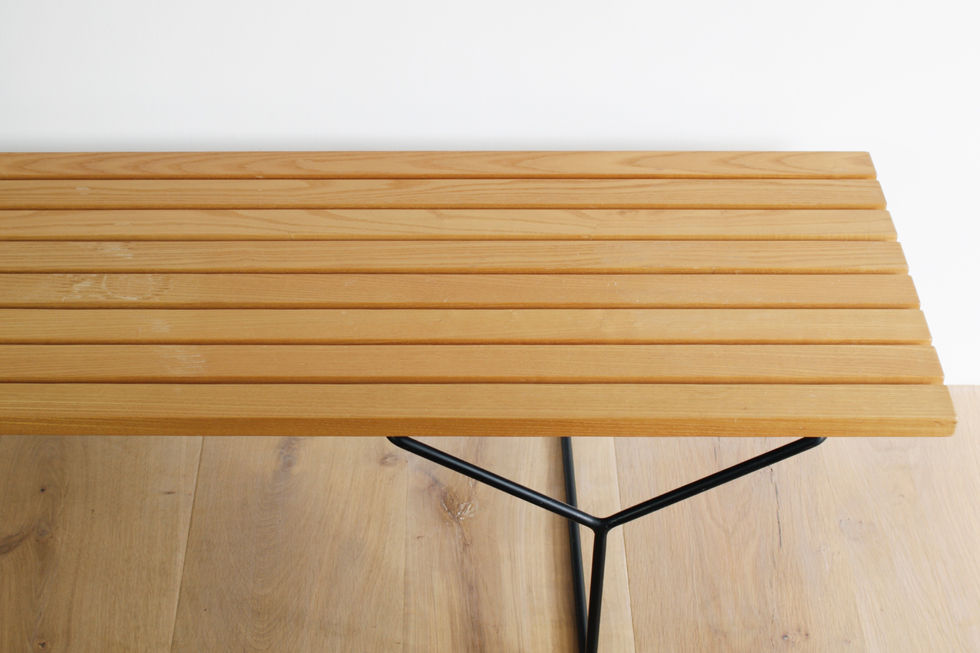 ハリー・ベルトイアがデザインしたKnoll社のスラットベンチです。オーク材の座面にブラックレッグのモデルになります。