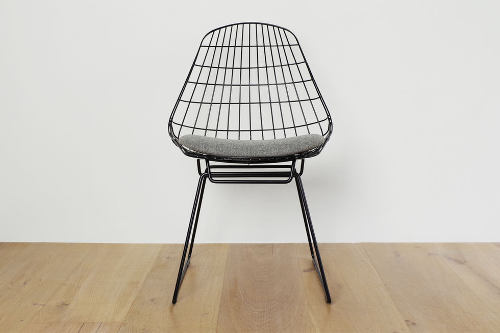 オランダ人デザイナー、ケース・ブラークマンがデザインしたPastoe社のワイヤーチェア「SM05」です。2011年から復刻されている現行品ユーズド、ブラックカラーの本体にグレーファブリックのシートパッドが付属します。
