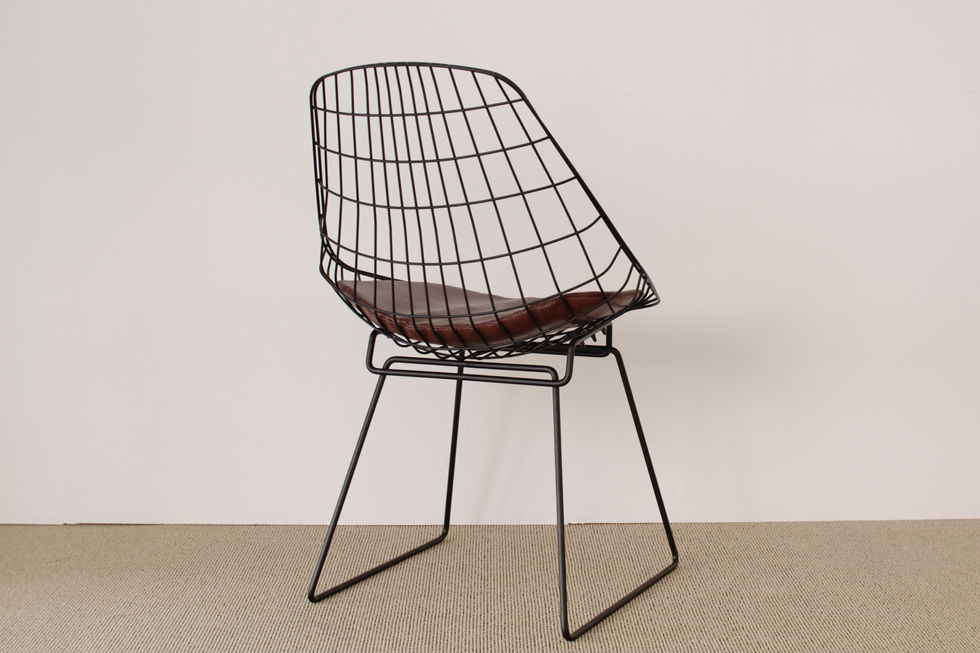細いワイヤーをグリッド状に張り巡らせ、イームズやベルトイアからの影響も垣間見えるデザインです。現在もPastoe社で生産されていますが、こちらは当時のオリジナル品で取り外しできるシートパッドが付属します。本体カラーはブラック、シートパッドはブラウンのビニルレザー製です。