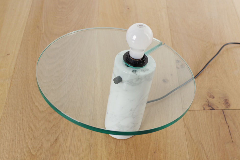 大理石製のシリンダーに厚さ12mmのガラスプレートを合わせ、大きなシェードを被せたテーブルランプ。横からのシルエットはその名の通り、スヌーピーにそっくりです。スイッチはタッチセンサー式で、軽く触れるだけでON/OFFと4段階の調光ができます。