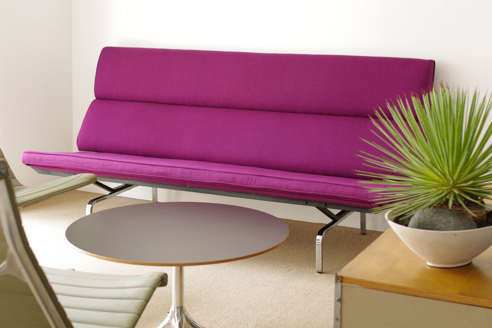 場所を取らない「コンパクトさ」と、手鏡の「コンパクトのように」折り畳みができることからネーミングされたソファ。イームズ夫妻が自宅用にデザインしたソファが原型となっていますが、現代の生活様式にも非常にマッチした機能的なソファ です。スチール製のベースと3枚のクッションパネルで構成され、面で体を支える構造になっています。座面下にはスプリングが敷かれ、座り心地も非常に良いものです。