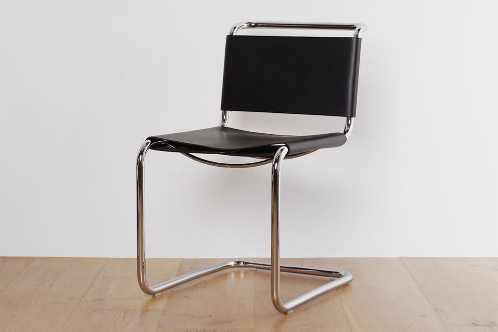 マルセル・ブロイヤーのチェスカチェアとミース・ファン・デル・ローエのMRチェアを融合させたデザイン。カンティレバー構造のフレームと厚革シートが優しく体を受け止め座り心地は大変素晴らしいものです。