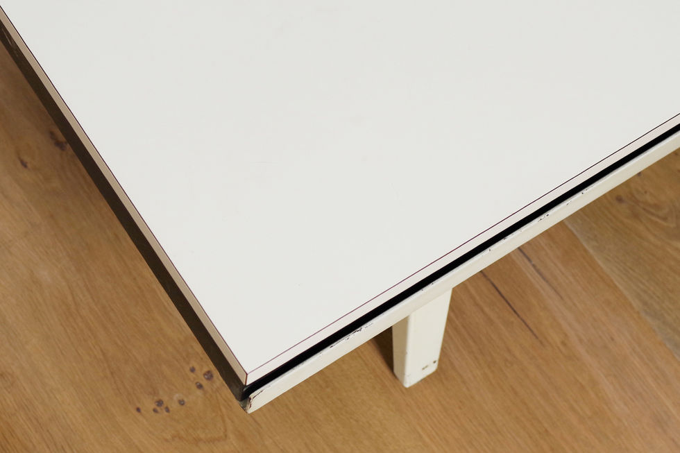 1954~74年の20年間、ハーマンミラー社で製造・販売されたジョージ・ネルソンのスチールフレームシーティングシリーズです。ホワイトカラーのスチールベースに1Pソファシート+ホワイトラミネート天板のセットになります。