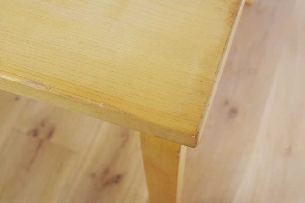アアルトのチェアやスツールと同様、アルテック社独自の製法で曲げられた4本のレッグで支えられたテーブル。飴色に焼けたバーチ材の雰囲気はヴィンテージモデルならではです。天板のエッジや角のわずかなR処理が人に優しく、小さなお子様がいるご家庭でも安心してお使いいただけます。
